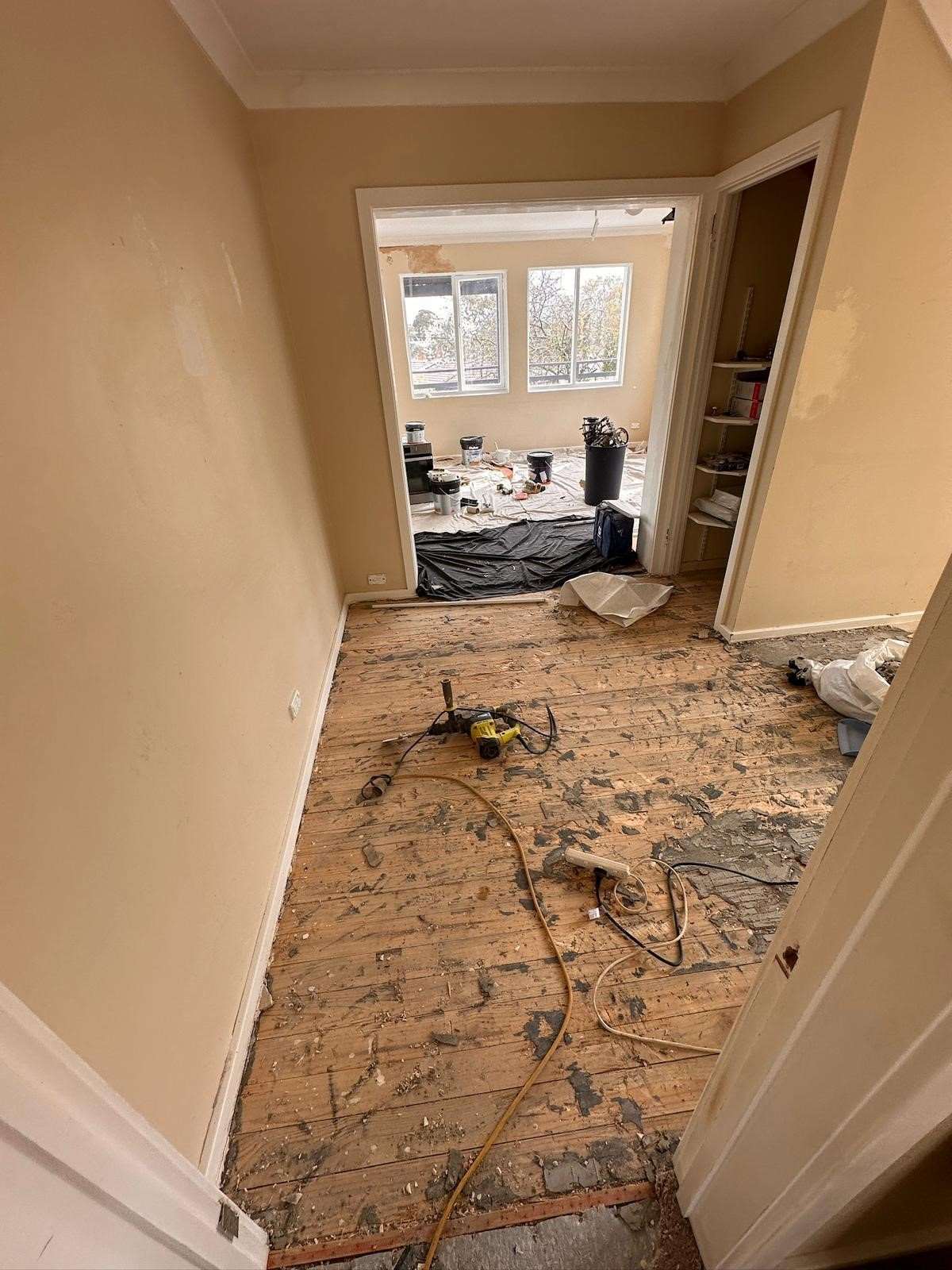 striped timber floor and sanding tools in deakin project